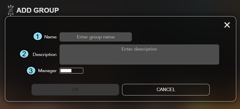 Name Description Editable after Group Creation 1. Name The Name of the group. No 2. Description The Description of the account. Yes 3. Manager Indicates whether or not this Group has manager privileges. Groups with manager privileges allow their users to log in to the Access and Identity Management Client and manage the Users, Groups, and Admin Dashboards. Yes - Click OK.