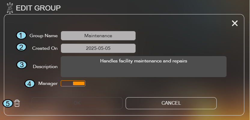 No 2. Created On The date the group was created. No 3. Description The Description of the group. Yes 4. Manager Toggle this option to enable or disable manager privileges for the group. Yes 5. Delete Click on the garbage icon to delete the profile. N/A -