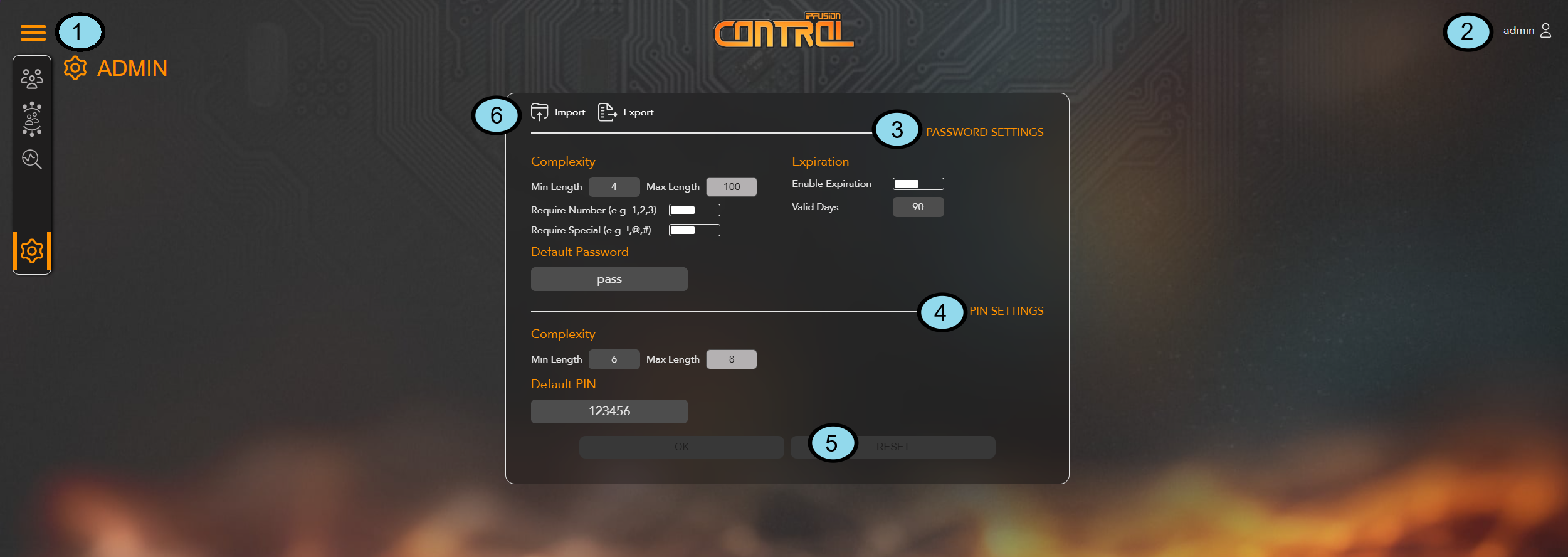 | 5. User Profile | Quickly access options to change the user’s password or PIN, or to logout. |