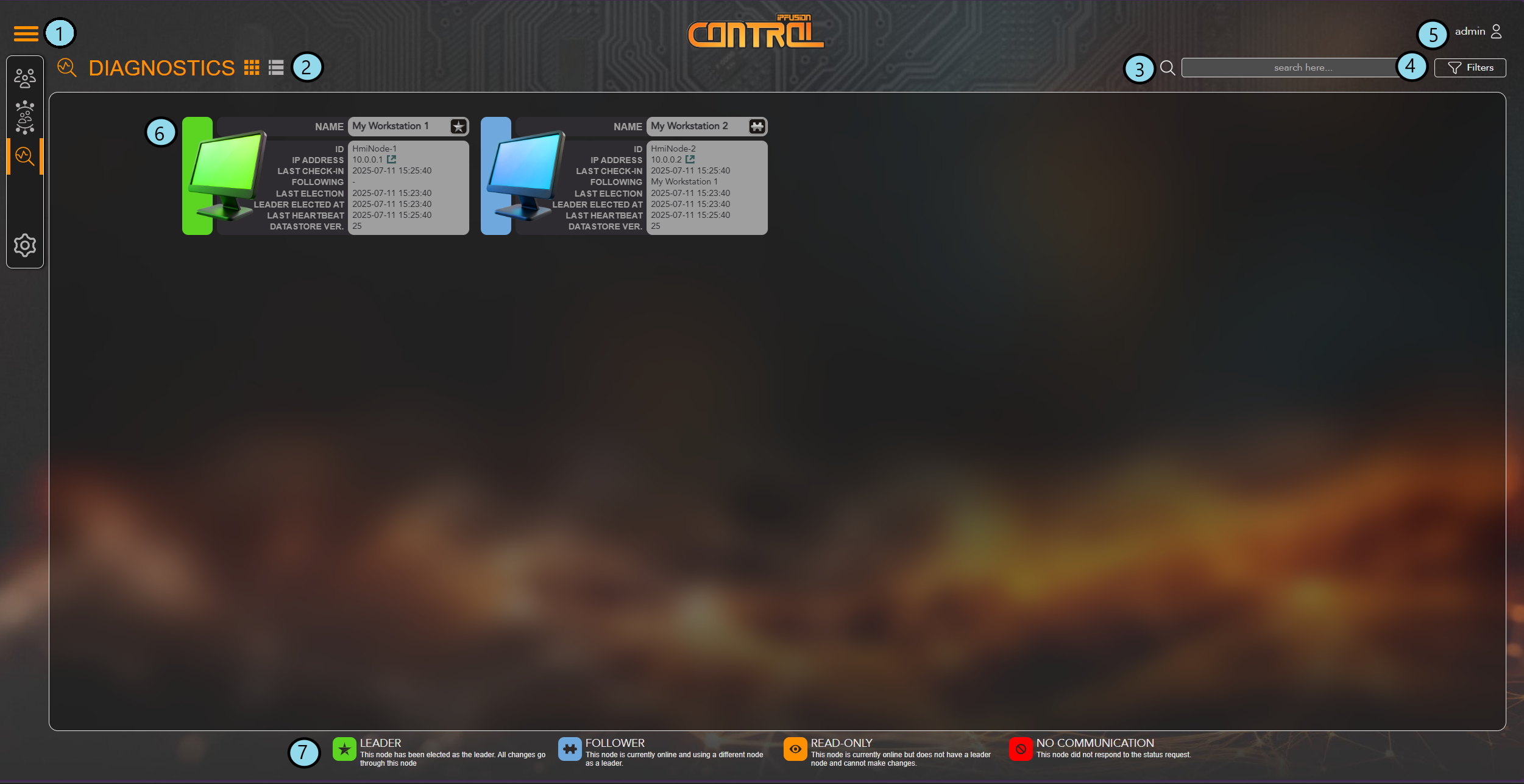 This dashboard lets you monitor the status of connected Workstations. This page can be accessed, regardless of the node state, at the following address: https://[IP address of Workstation]:5253/diagnostics.