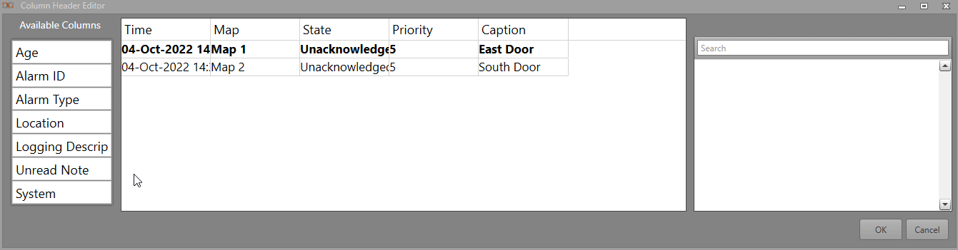 The Alarm Grid displays a list containing information about active alarms. This is used to provide a central place where a Runtime operator can view these alarms. This is useful if you have a large number of Maps or assets, as you can view the alarms without having to go to each individual Map.