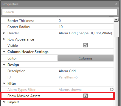 In Runtime the alarms are displayed in this grid. The default order is the oldest and highest priority alarm first. To remove an alarm, you must Acknowledge and Reset it. If you do not Reset the alarm after acknowledging, it will remain in the list with an Acknowledged state. The Alarm Grid will automatically scroll to your currently selected asset if it moves in the list. This can occur after actions such as acknowledging or masking the asset. If you select an asset from the Alarm Grid, you will be automatically navigated to the Map containing that asset (if the Map is available for navigation). If your asset has icons on multiple Maps, including the one which you are currently navigated to, you will not be navigated away from the current Map.