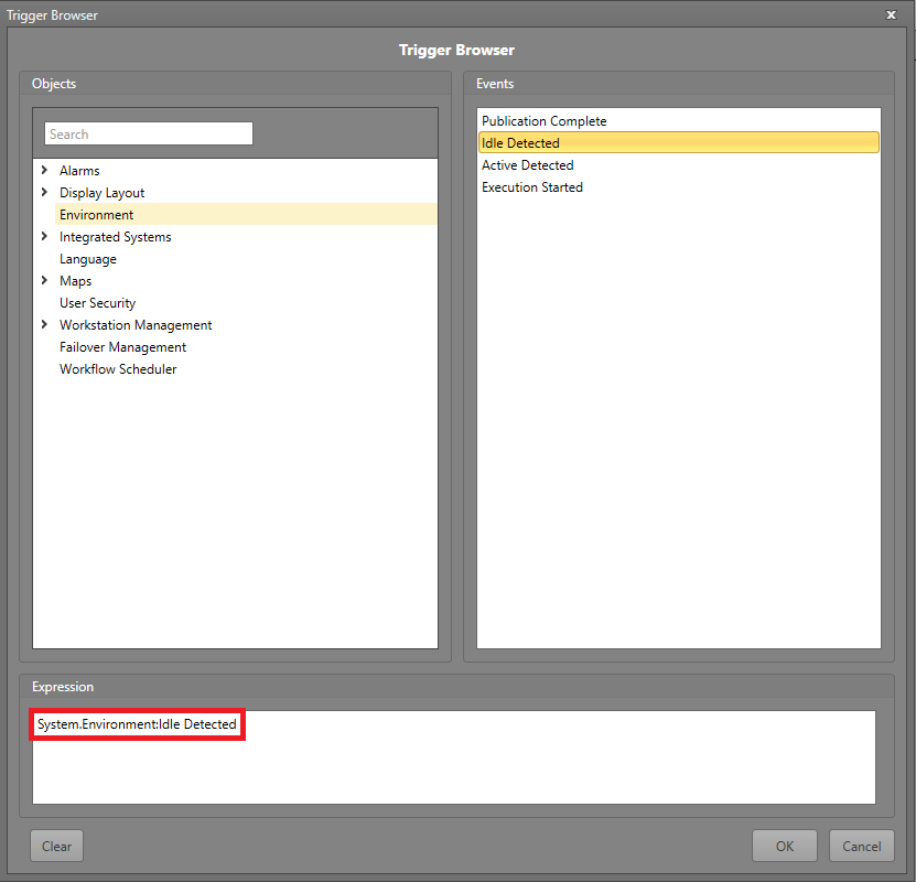 The timer will count down from its configured time and be reset by activity at the Workstation. If the timer finishes counting down, an Idle Detected trigger will occur. On the next instance of activity, an Active Detected trigger will occur and reset Inactivity Time.
