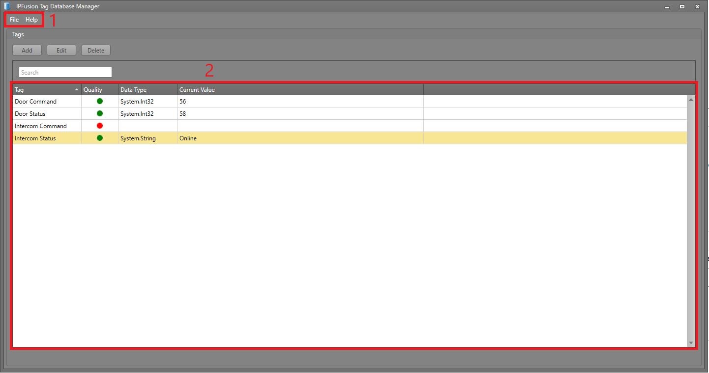 - Live Tag Display — This section shows the actual OPC tag data and allows you to Add, Edit, or Delete tags.