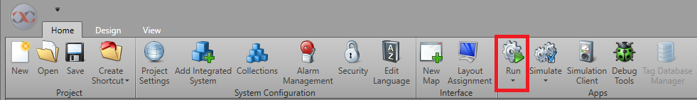 To launch Runtime from Designer, go to the Home tab and click Run.