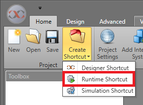 Runtime can be launched directly from a shortcut. If you need to create a shortcut, in Designer click Create Shortcut. Select the Runtime Shortcut.