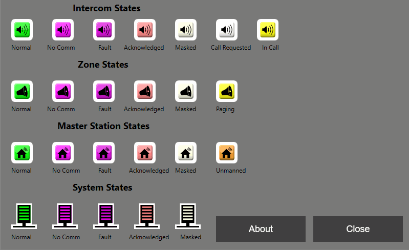 A Legend is a visual key that explains icons and colors representing system statuses. It consists of a canvas displaying status icons. Each Integrated System has associated status icons in the Legend that represent its range of possible statuses. Legends are especially useful when displayed alongside alarms in Runtime, as they make it easier for users to understand the meaning of the colors and symbols. It is also possible to move the Legend across all Display Layout screens in Runtime.