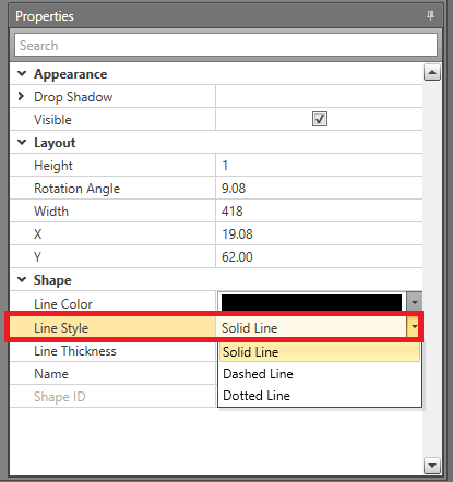 The appearance of lines and shapes outlines can be set in Designer. The line can be either solid, dashed, or dotted. This can be useful for differentiating the purpose of different shapes. The line style can be changed on these shapes: ellipse, line, polygon, polyline, and rectangle.