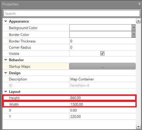 3. In the Properties grid, set the Height and Width to be the same as the values for the Maps displayed in this container. If these values are different than the size of the displayed Maps, they will not display correctly. The Maps will not resize to fit the container.