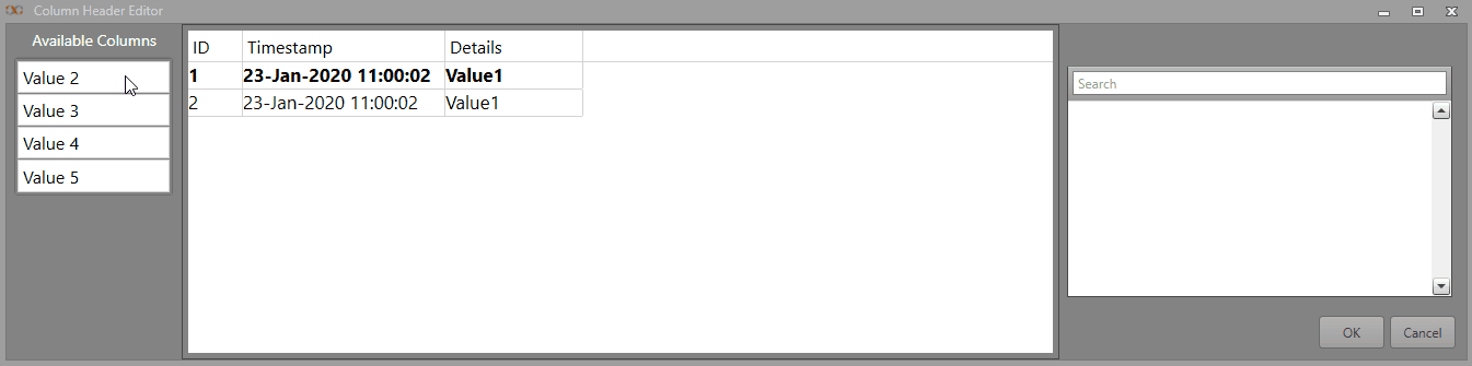 Table 1. Column Header Settings Background The Background color of the header. Font Settings — Font Name The Name of the Font used in the column header. Font Settings — Font Size The Size of the header text. Font Settings — Is Bold Check this to Bold the header text. Font Settings — Is Italic Check this to italicize the header text. Font Settings — Line Spacing The spacing between lines of text in the header. Font Settings — Strikethrough Check this to add a Strikethrough to the header text. Font Settings — Text Alignment The Alignment of the column header text. Font Settings — Text Color The Color of the column header text. Font Settings — Underlined Check this to underline the column header text. Title The text for the column header. Width The Width of the column in pixels. Row Background Color The Background Color displayed on the rows. Minimum Row Height The smallest height the rows can have. If the font size of the row text requires more space, the row will automatically resize to fit the text. Table 2. Row Font Font Name The Font used for the rows. Font Color The Color used for the row text. Font Size The Size of the text in the rows. Is Bold Check this to Bold the row text. Is Italic Check this to italicize the row text. Table 3. Runtime Settings Allow Runtime Filtering Check this to allow filtering on this column in Runtime. Allow Runtime Sorting Check this to allow sorting on this column in Runtime. Note: If conditional formatting is used, the above settings will be overridden. - Click OK.