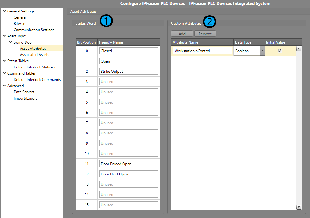 Under Assets Attributes is an example of setting up a Status Word chart. This will vary depending on your project, but in this specific case, five bits will be used to enable the asset to function. Only one Custom Attribute is required for this asset, and that is to grant access to a specific Workstation.