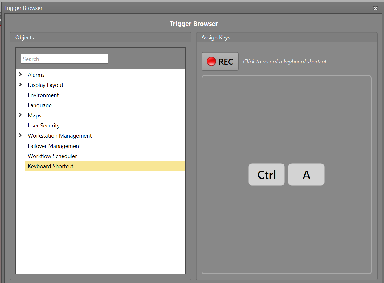 Keyboard shortcuts can be used as Workflow triggers. This can be used for you to be able to manually trigger a Workflow with ease. For example, you could configure Ctrl+A to acknowledge all alarms in Runtime.