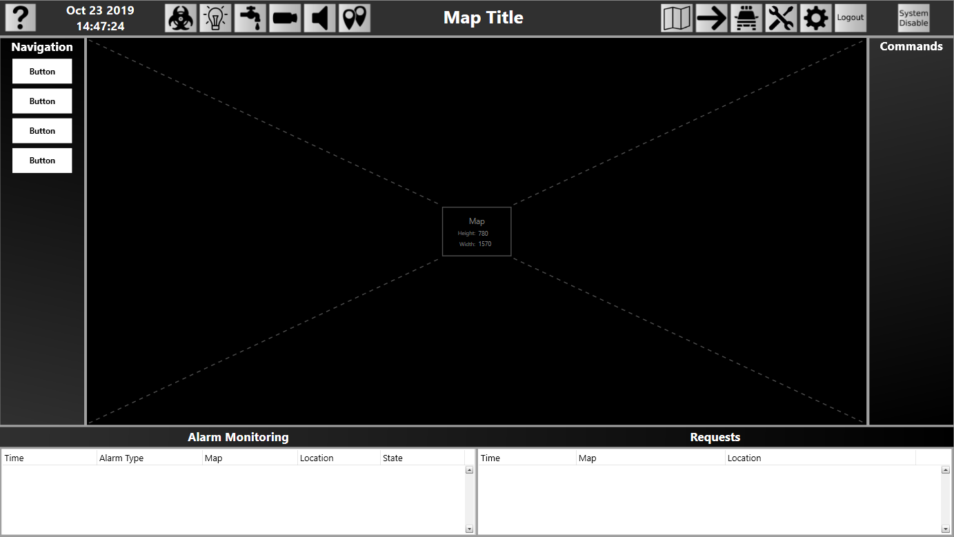 A Display Layout is the layout that will be shown on a Runtime Workstation monitor. This can contain items such as Maps, controls, Video Viewers, and more. A Workstation can have multiple Display Layouts assigned, and a layout can be used on multiple Workstations.